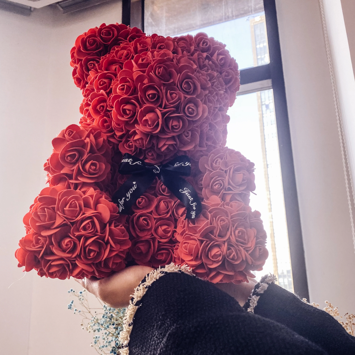 Мечето от рози е ръчно изработено от над 500 синтетични рози, които символизират любовта, така че това е най-красивият начин да се закълнете на любимите си хора във вечна любов и привързаност.